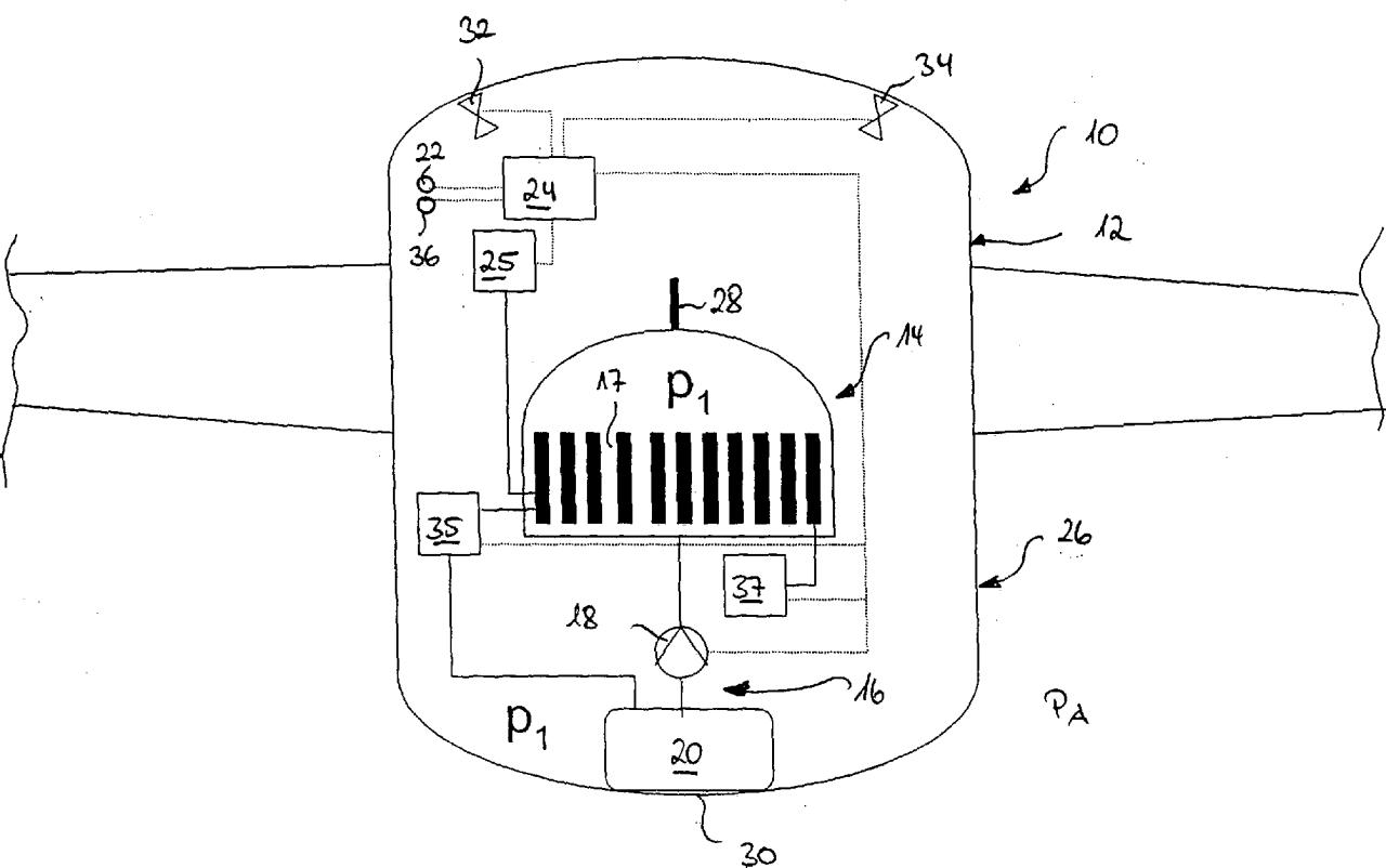 [0031] Um im Betrieb der Brennstoffzelle eine unerwünschte Verdampfung von in der Brennstoffzelle üblicherweise in flüssiger Form vorhandenen Stoffen und/oder Stoffgemischen zu verhindern, ist die Steuereinheit zur Steuerung des Brennstoffzellenbetriebsdruckerzeugungssystems vorzugsweise dazu eingerichtet, das Brennstoffzellenbetriebsdruckerzeugungssystem so zu steuern, dass in der Brennstoffzelle ein Druck erzeugt wird, bei dem ein unerwünschtes Verdampfen von in der Brennstoffzelle üblicherweise in flüssiger Form vorhandenen Stoffen und/oder Stoffgemischen verhindert wird.